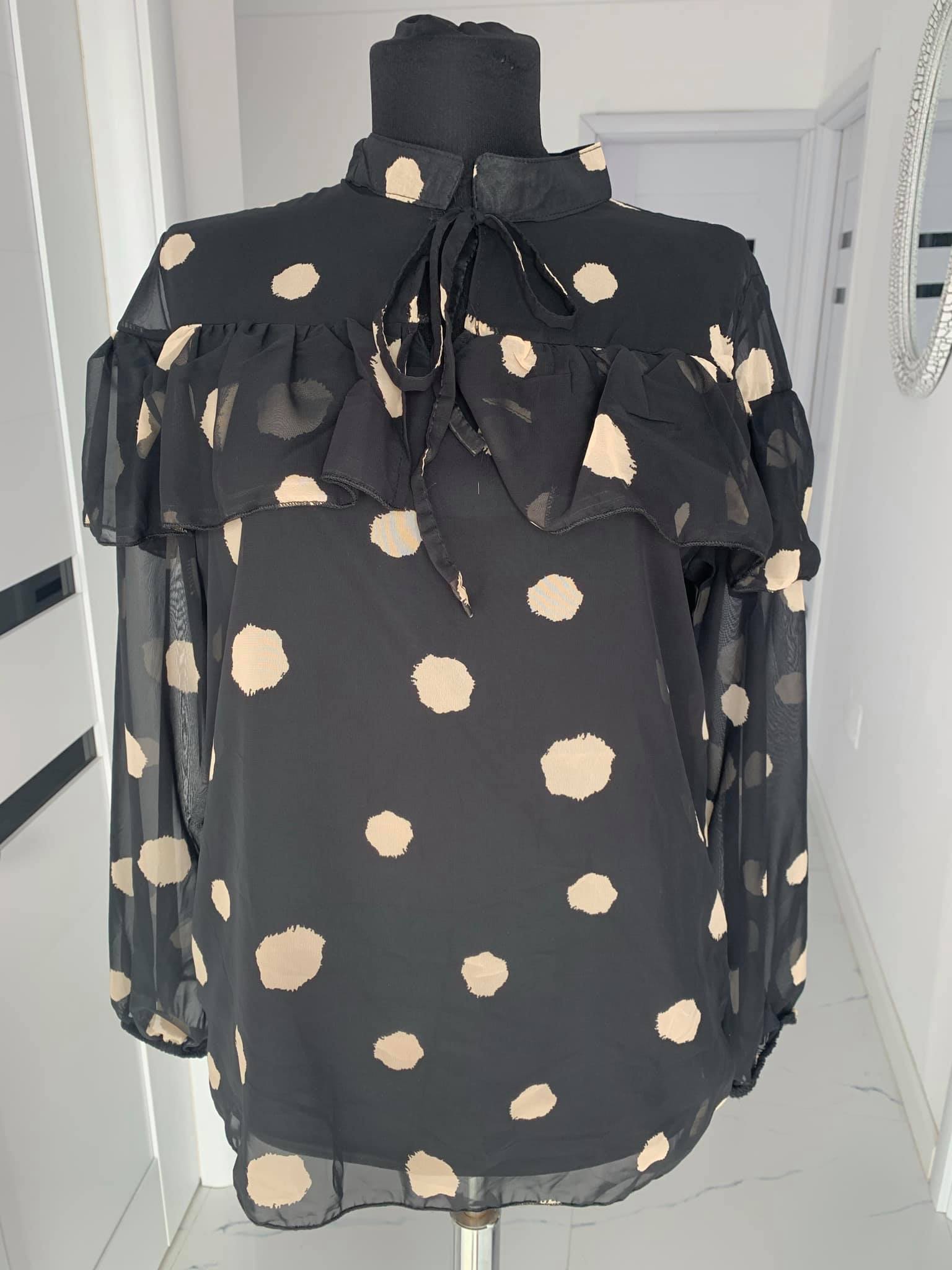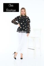 Bluza din voal, cu buline, cu maneca lunga si manseta cu elastic, decorata cu volane asimetrice si fundita care se leaga la gat. Bluza are captuseala. Acest model este disponibil pe mai multe culori.