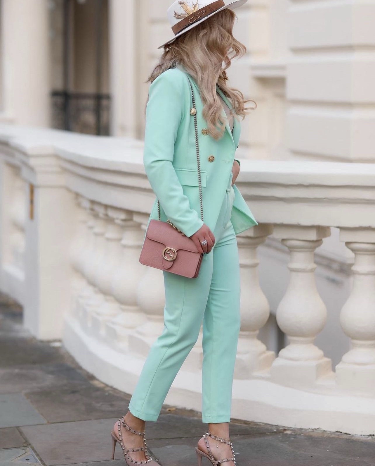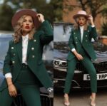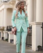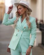 🌸 Costum elegant cu sacou și pantaloni cu croială dreaptă si talie înaltă și centură inclusă, din stofă elastică.