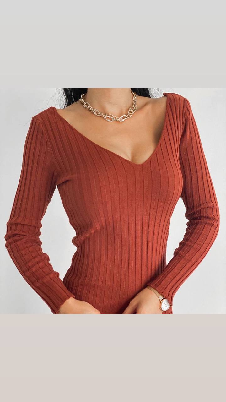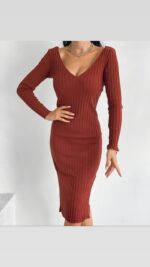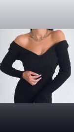 NOU🌸 Rochie midi tricotată cu decolteu in anchior și mânecă lungă