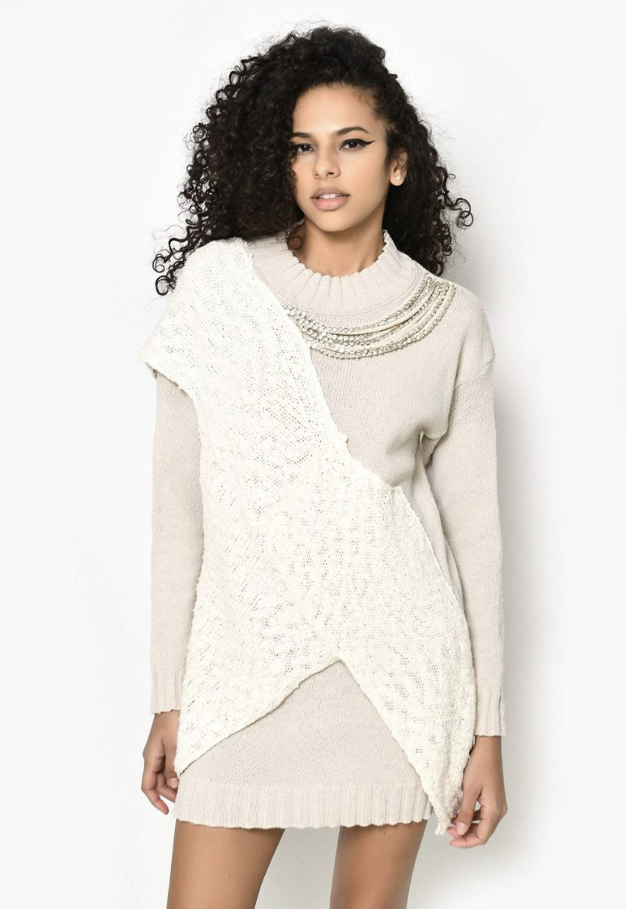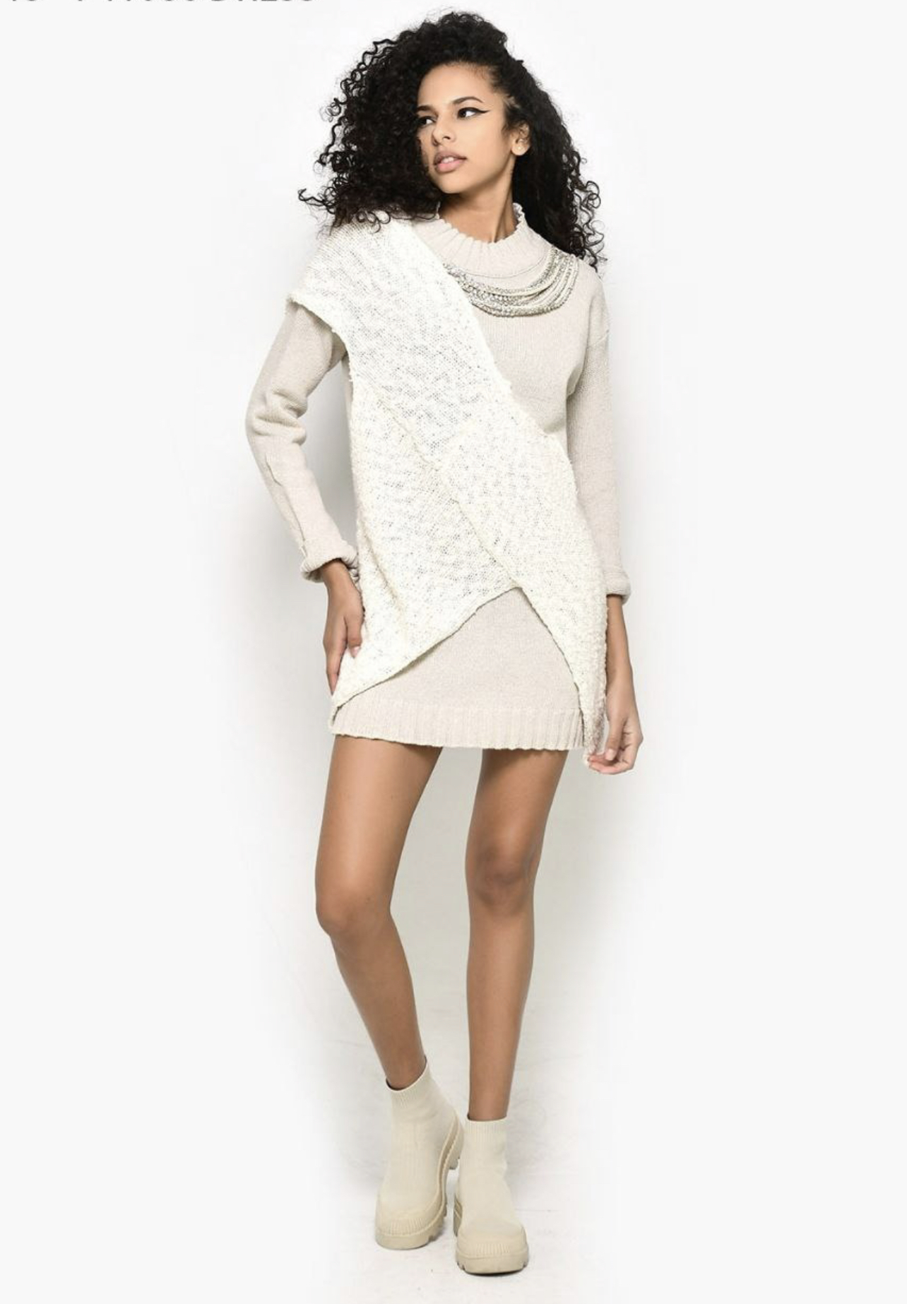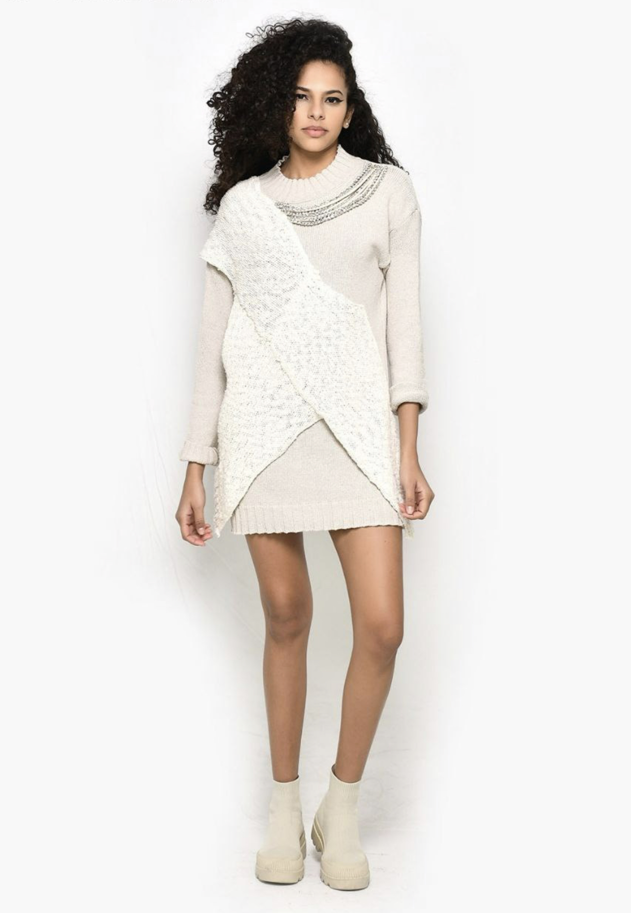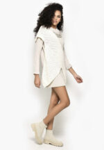 Rochie – pulover, model deosebit, cu aplicații din material împletit